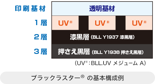 上記写真はBLL.UV 透明色を使用したブラックラスター®の印刷物のイメージです。実際の見え方とは異なる場合がございます。
